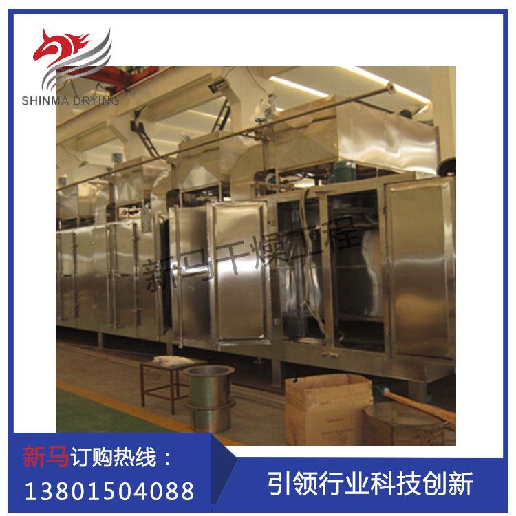 整臺設(shè)備為全封閉型(對物料而言),加料系統(tǒng)、熱風(fēng)系統(tǒng)、出料系統(tǒng)和排濕系統(tǒng)五部分組成。加料段作用使物料均勻分散在網(wǎng)板上,并且勻速輸送到干燥段;熱風(fēng)系統(tǒng)是提供干燥所需的熱源,提供約150℃熱風(fēng)至干燥室;在輸送帶通過時,熱空氣從上往下或從下往上通過輸送帶上的物料,從而使物料能均勻干燥,由出料段排出。