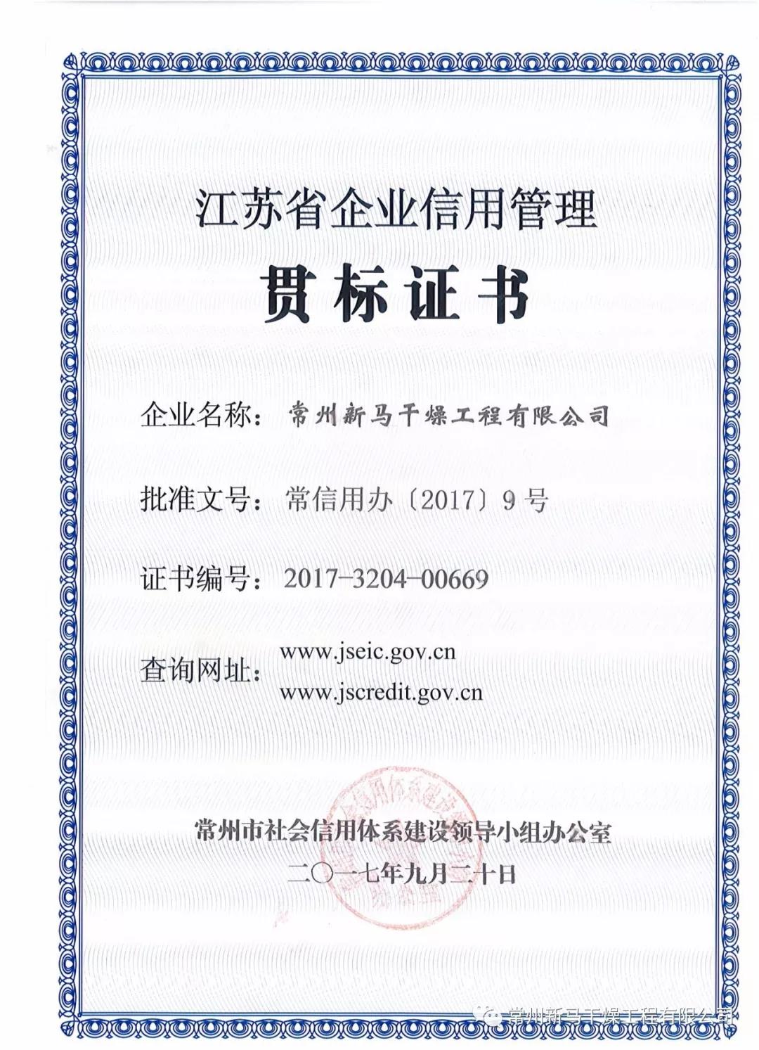 獲得科技創新先進集體的同時,常州新馬通過江蘇省社會信用體系建設領導小組辦公室嚴格的審核評定,榮獲“江蘇省企業信用管理貫標企業”榮譽,近日正式拿到該證書。
