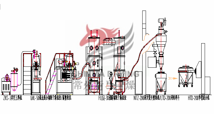 此次出口柬埔寨成套制粒聯動線設備包含高速混合制粒機(含KZL-300)、沸騰制粒機、噴嘴制粒系統等。(下圖為制粒聯動線設計方案參考圖)
